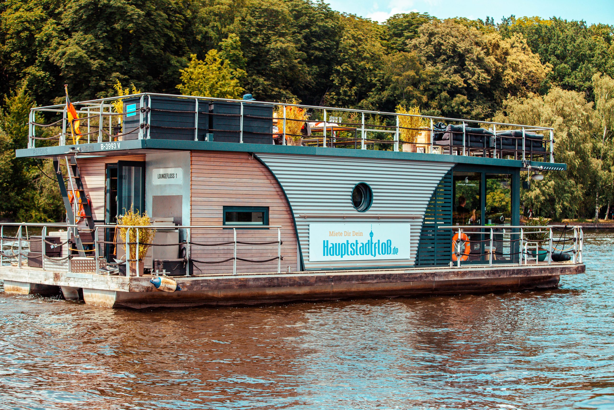 Floßboote gibt es in verschiedenen Größen und auch so groß, dass man mit bis zu 20 Personen darauf feiern kann – dieses Floßboot ist dann aufgrund der Größe allerdings führerscheinpflichtig. Die meisten Floßboote haben einen überdachten Fahrgastraum, sodass die Boote auch bei Regenwetter bestens geeignet sind.